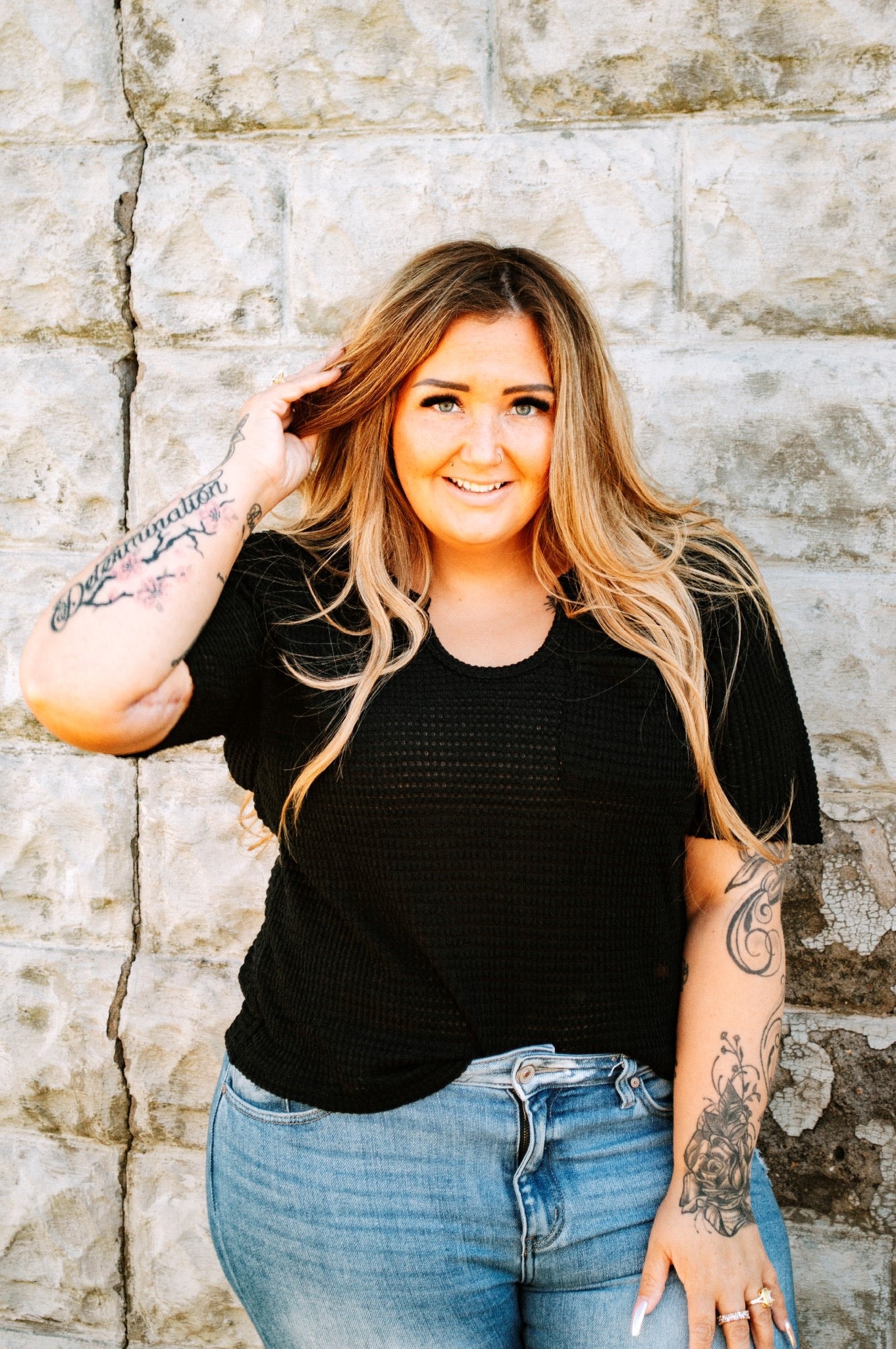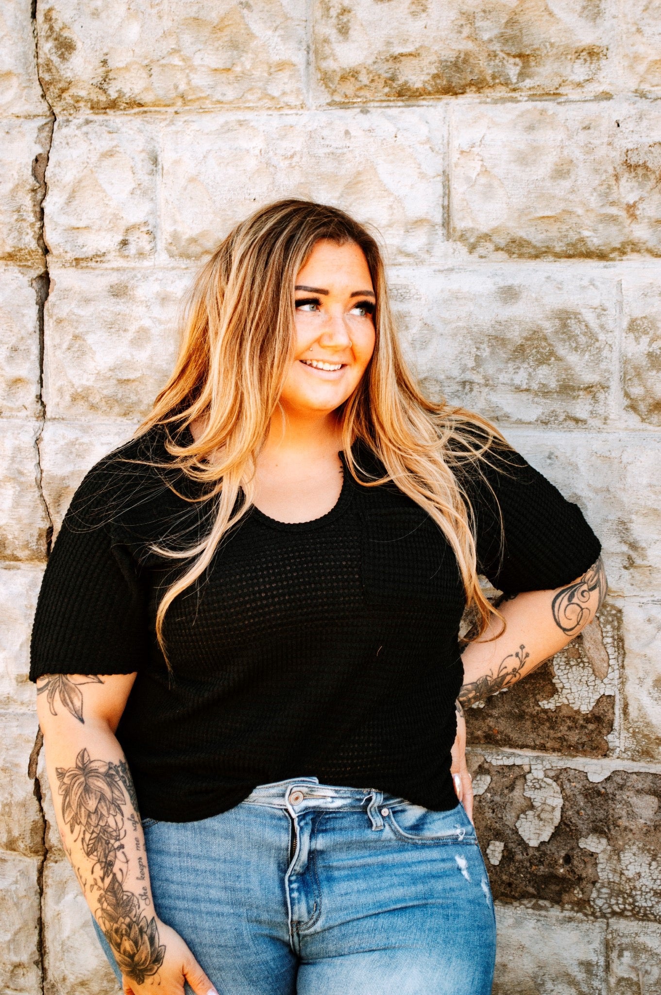 Black Short Sleeve Waffle Knit Top